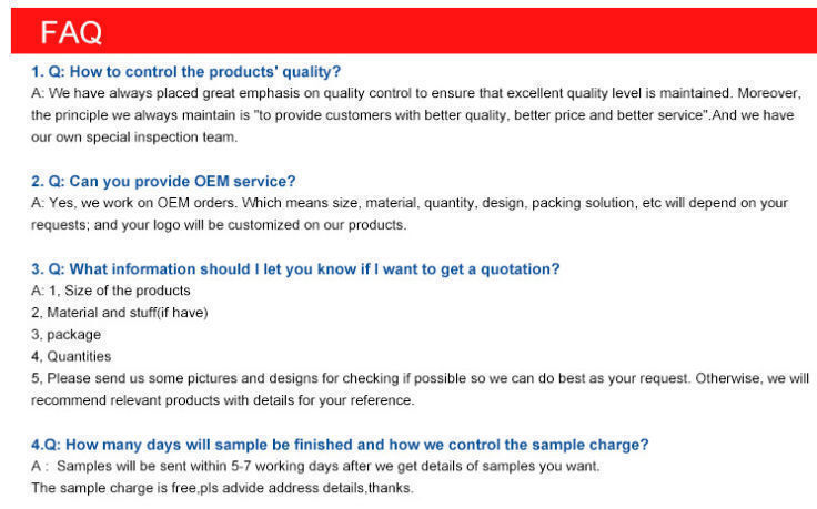 We have always placed great emphasis on quality control to ensure that excellent quality level is maintained. Moreover, the principle we always maintain is "to provide customers with better quality, better price and better service".And we have our own special inspection team.