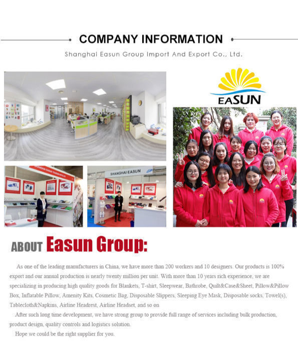 | Material | Eye mask:100% polyester,satin, micplush, cotton, TC and so on Socks:100%polyester ,100%cotton,or TC Earplug:sponge Toothbrush:Handle:ps or pp, bristle:nylon Puzzle: paper or plastic or others Activity book:80g paper bag:420T polyester,cotton, nylon and so on Customized according to your requirements |