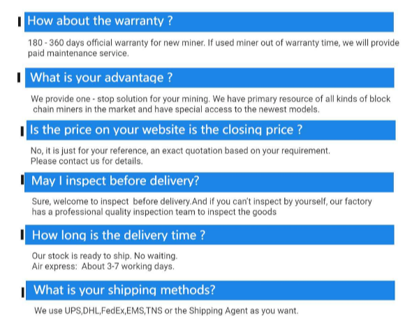 | Supplying brand | Bitmain/IceRiver/ Goldshell/ Innosilicon/ Whatsminer/ Avalon/ Love core...(if you need other model please let me know ) |
