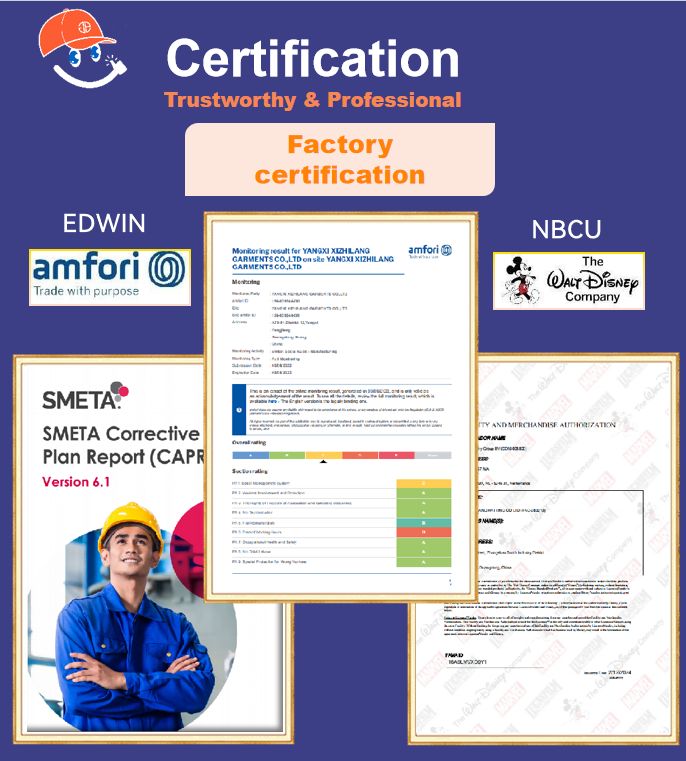 We have all kinds of certificate, BSCI, ISO9001, OEKO-TEX...with 150 to 200pcs worker, 50 different machine,.
