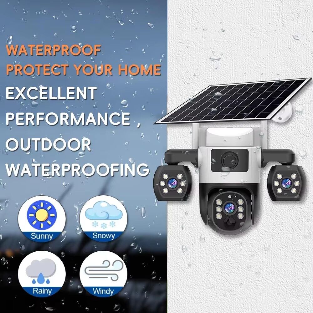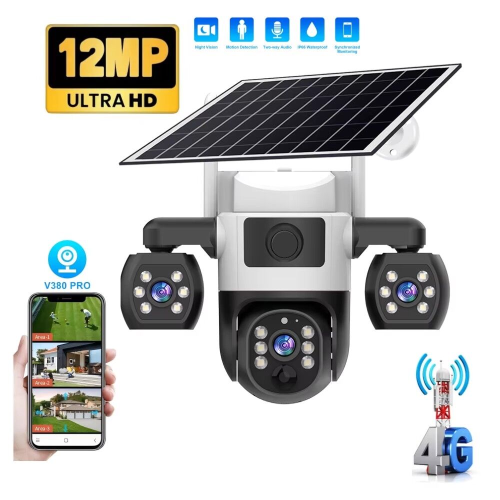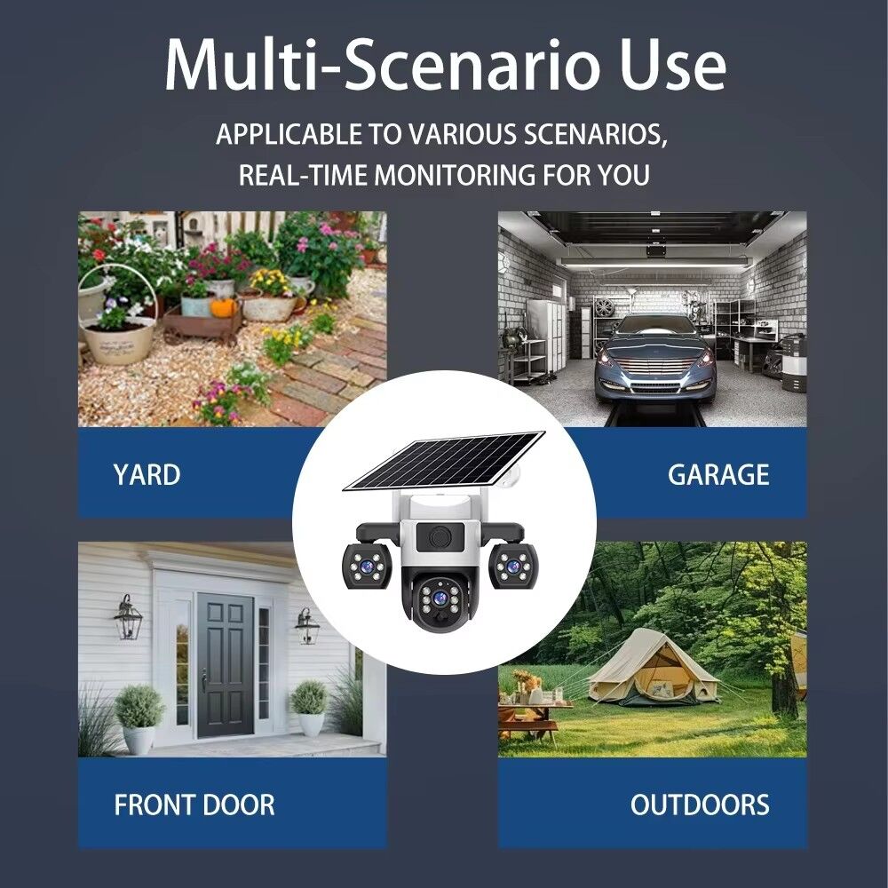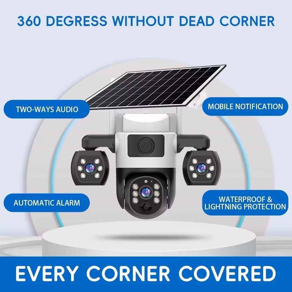 The V380 Pro Security Solar Camera is a high-performance outdoor surveillance solution designed to meet all your safety monitoring needs, whether for home, property, or small business use. Equipped with three lenses and three screens, this outdoor CCTV camera delivers a 360° viewing angle, ensuring no blind spots in your monitoring area—you can easily cover wide spaces like yards, driveways, or warehouse perimeters without missing any details.