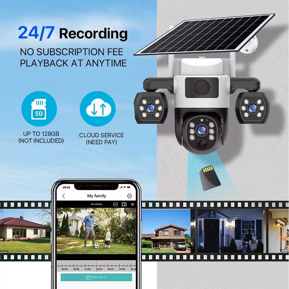 As a 4G WiFi solar camera, it offers dual-network connectivity: you can connect to WiFi for stable indoor/outdoor coverage or use a SIM card for areas without WiFi, making it ideal for remote locations like farms, construction sites, or vacation homes. The built-in solar panel and 8000mAh battery provide long-lasting power—no need for frequent charging or wired power supplies, saving you time and installation costs while ensuring 24/7 uninterrupted monitoring.