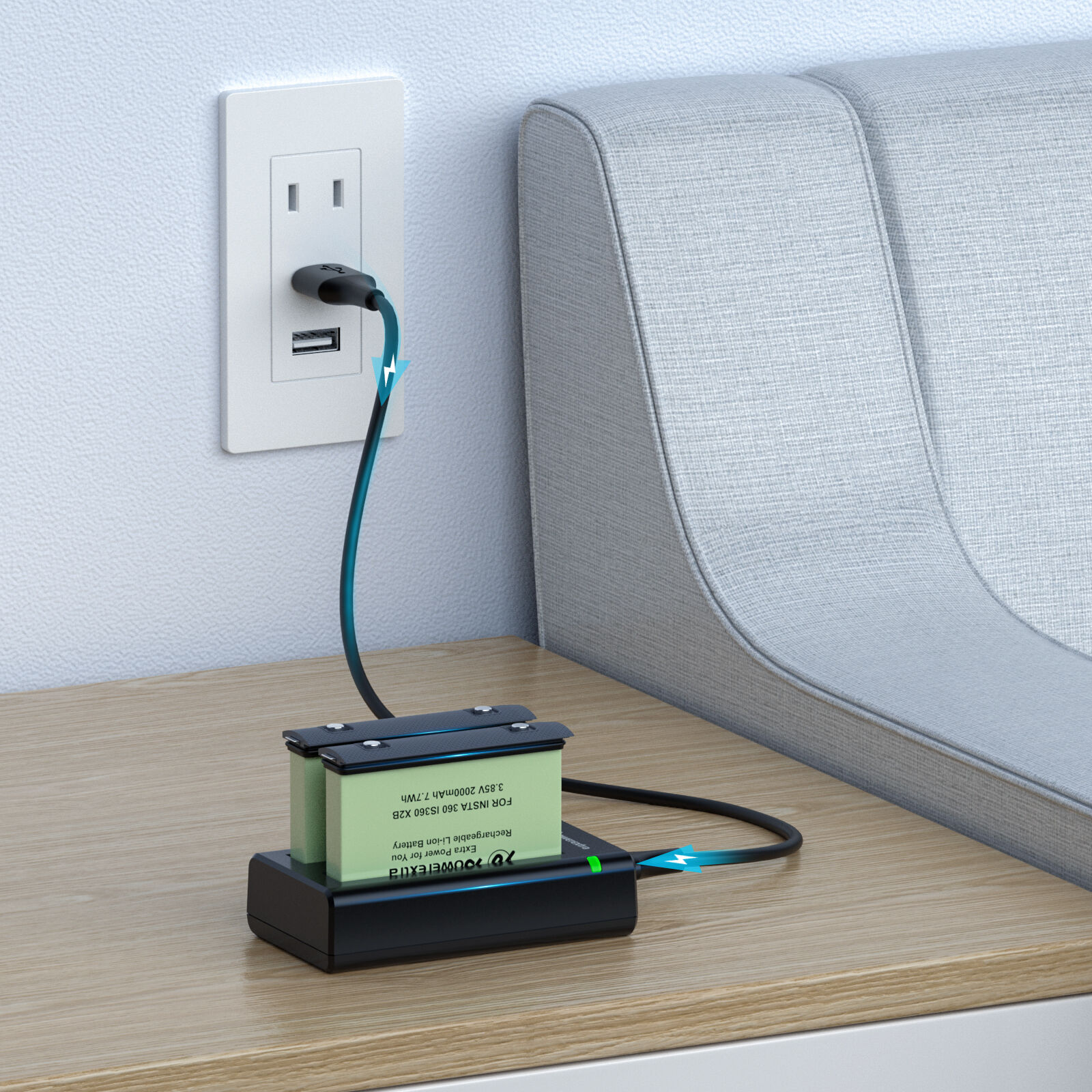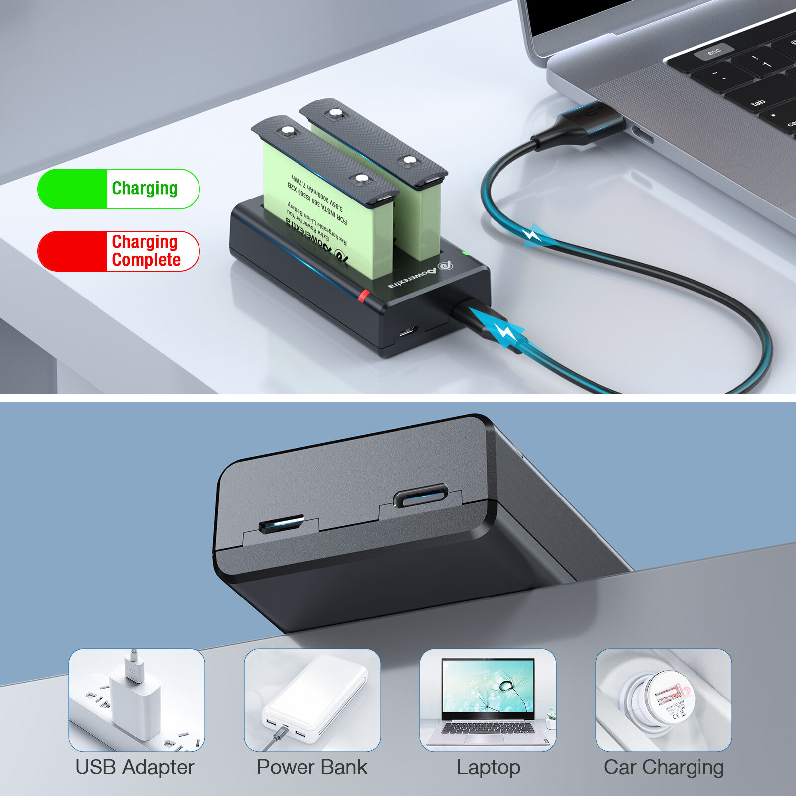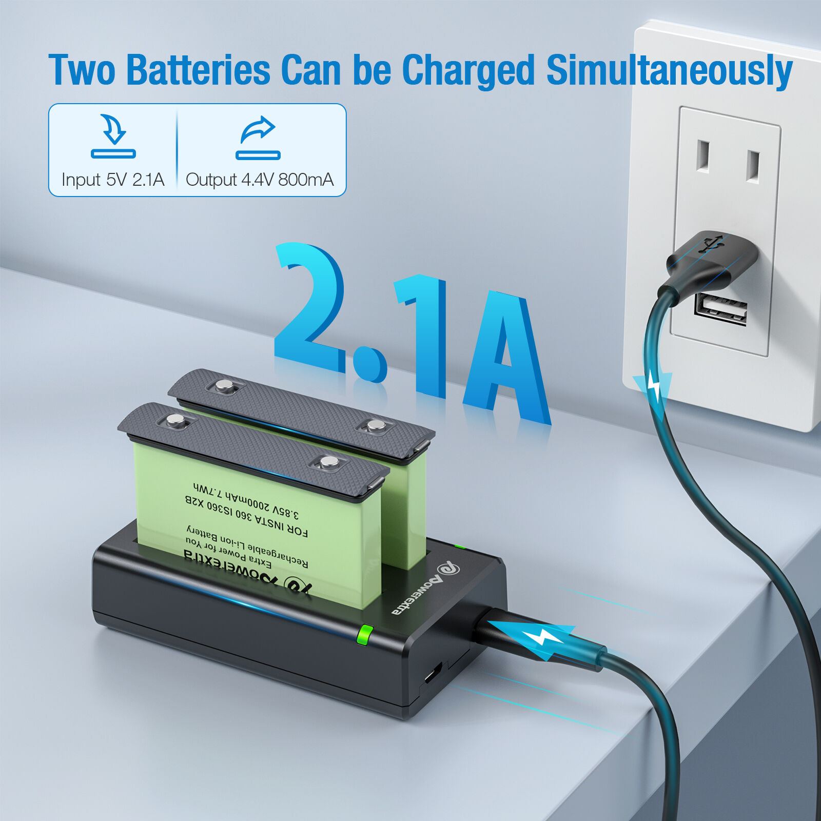- ✔ Intelligent Fast Charger & Smart LED Indicator: Two batteries can be charged simultaneously, supports 5V 2.1A input and 4.4V 800mA (per port) output. Smart LED on the Insta360 ONE X2 battery charger shows your battery charging process, easy to check the charging status.