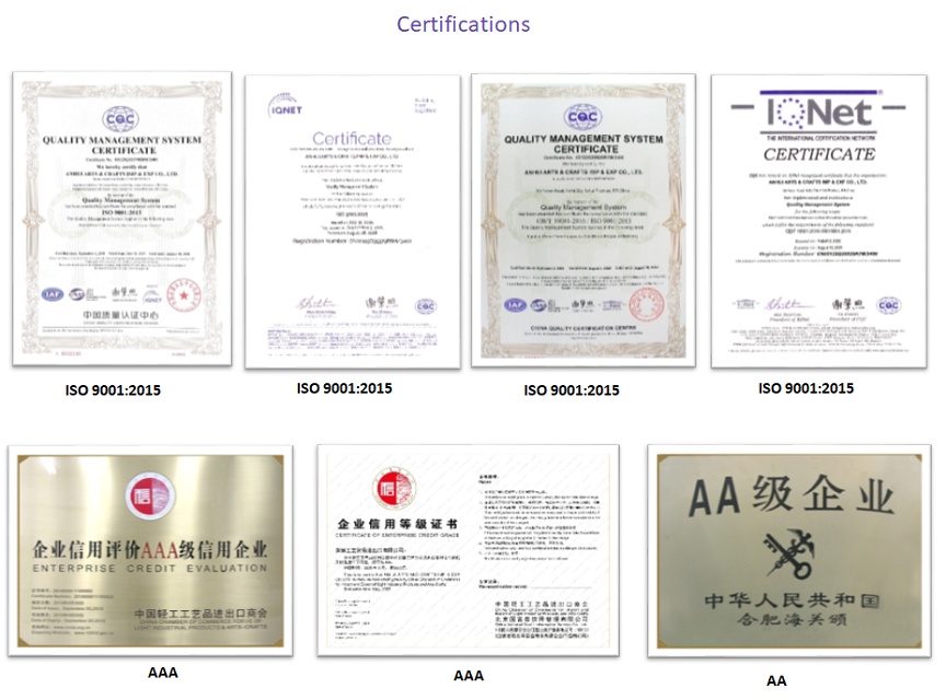 Anhui Arts & Crafts Import & Export Co., Ltd. set up in 1984 and reorganized in 2002, is a large-scale professional foreign trade enterprise that implements ISO9001:2000 international standardization management and obtained certification under the quality management system in 2001. Our products have been exported to over 100 countries, where its high-quality offerings and comprehensive service have earned widespread customer recognition and an increasing number of orders.