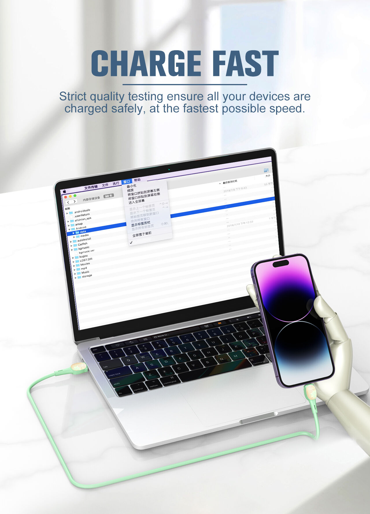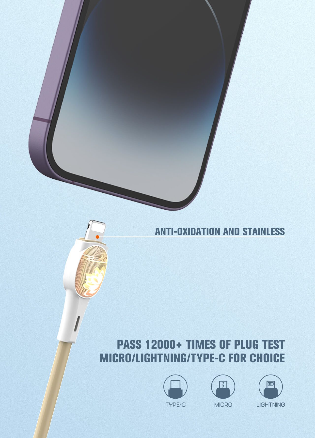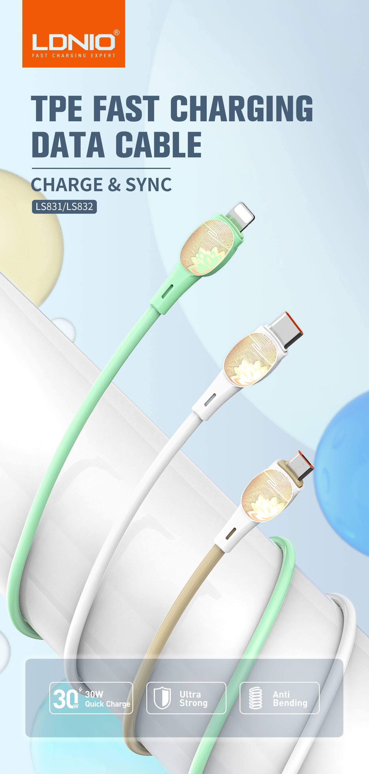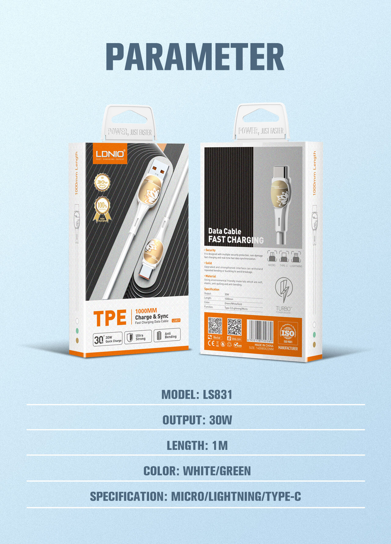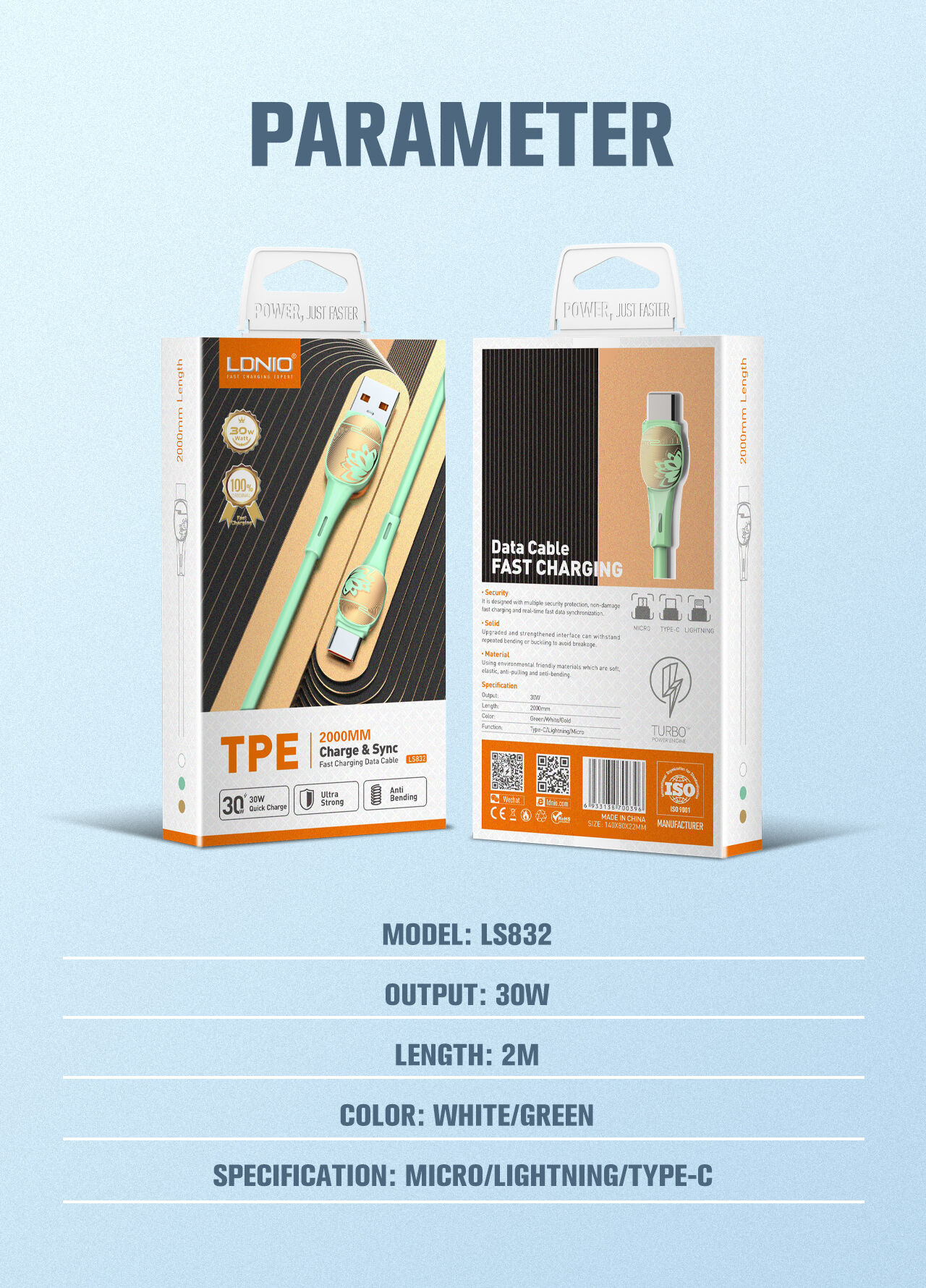 | Specification | 30W Fast Charging Data Cable 1, Length: 1m 2. Material: TPE 3. Core:(43/0.08)*2C+(16/0.08)*2 4. Rate power:30W |