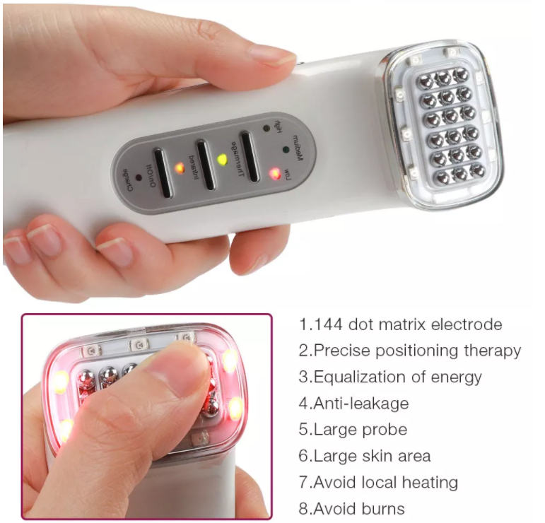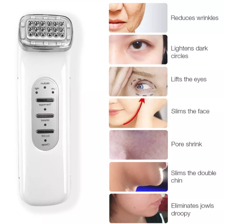 RF is Radio Frequency. It's a high-frequency electro-magnetic wave which could input electromagnetic energyinto dermal layers of the skin, stimulate the dermis.activate the collagen shrinking and re-generating,increase the thickness and density, soit could tighten andlift the loose skin, remove wrinkle and scar, make skinelastic and glossy.lt's also called Thermage.