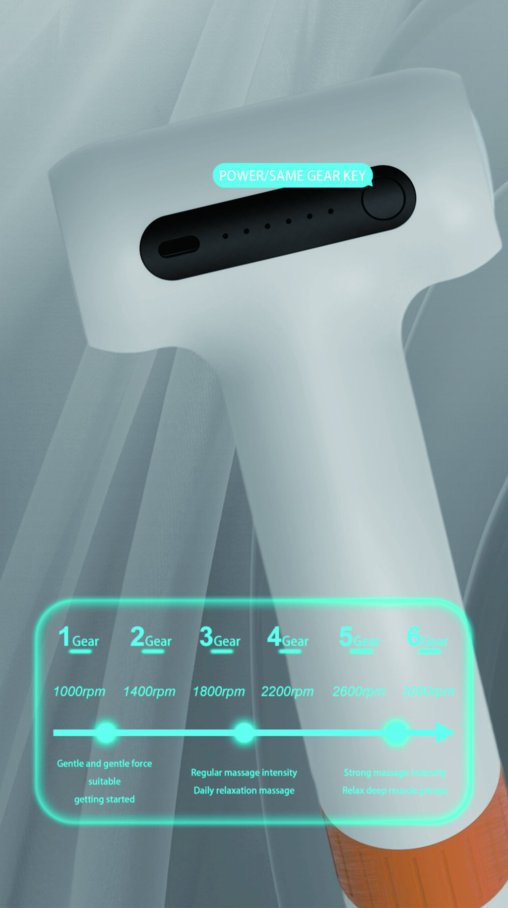 8、The speed intensity has 6 level from slow to fast , you can adjust what speed you want ; Deliver up to 3600 percussions per minute ;
