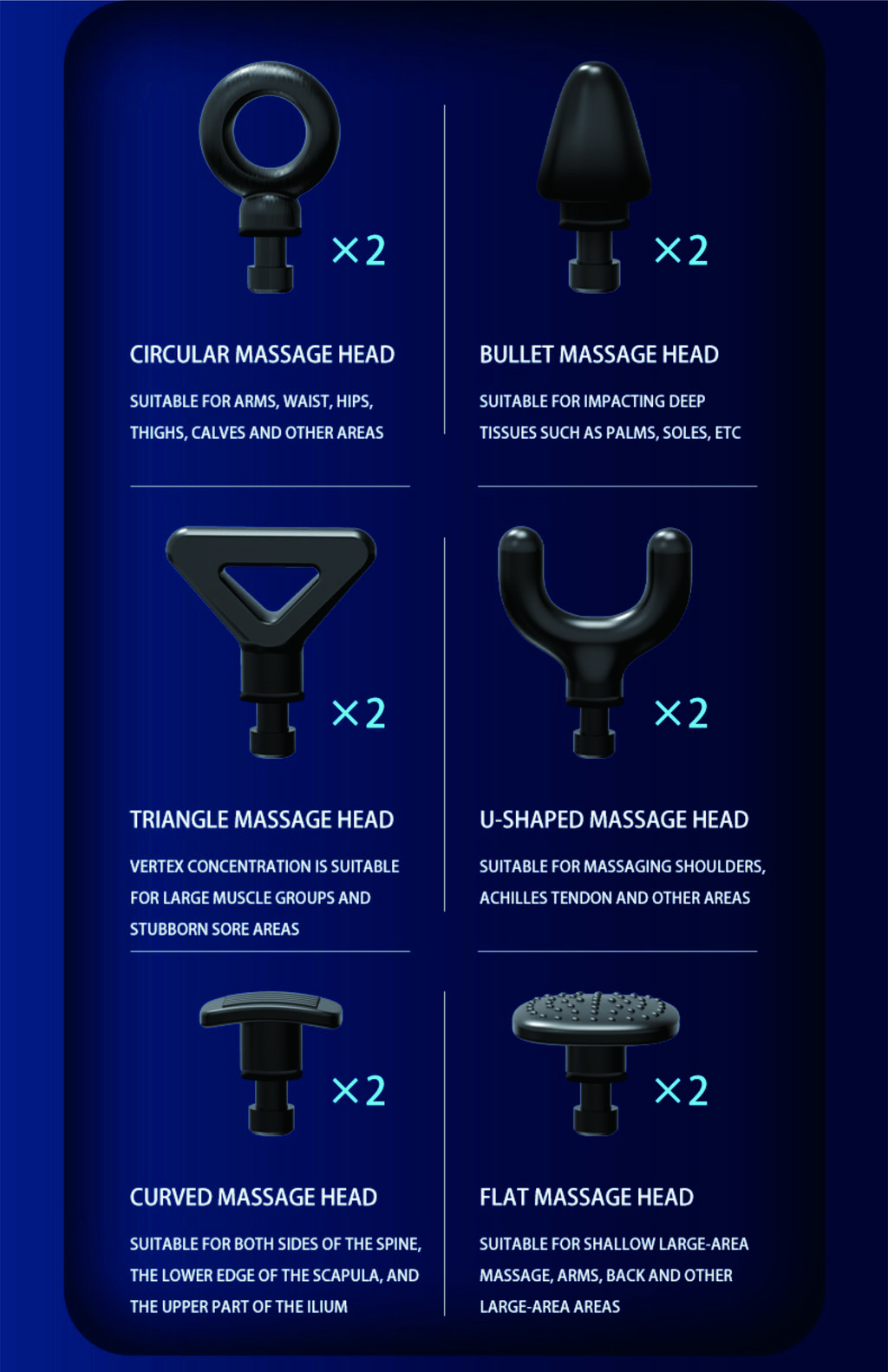 3、6 kinds of detachable head attachments and each kind with 2 heads , you can choose which style you want . It can bring double relax and happiness ;