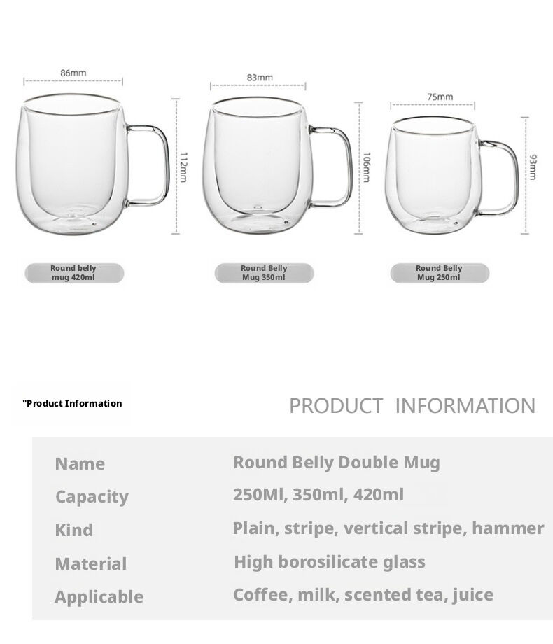 Design: Double-wall, with handle, available in plain, striped, or hammered texture Features: