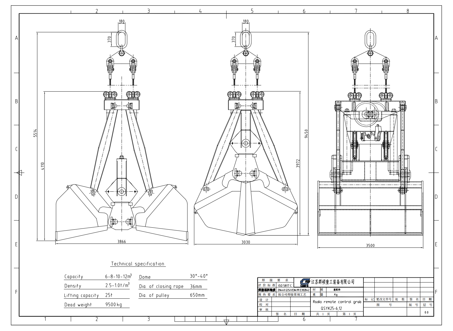 | Model | SWL (t) | Dead weight (t) | Capacity (m3) | Wire rope diameter (mm) | Pulley | Overall dimensions(mm) | |||||