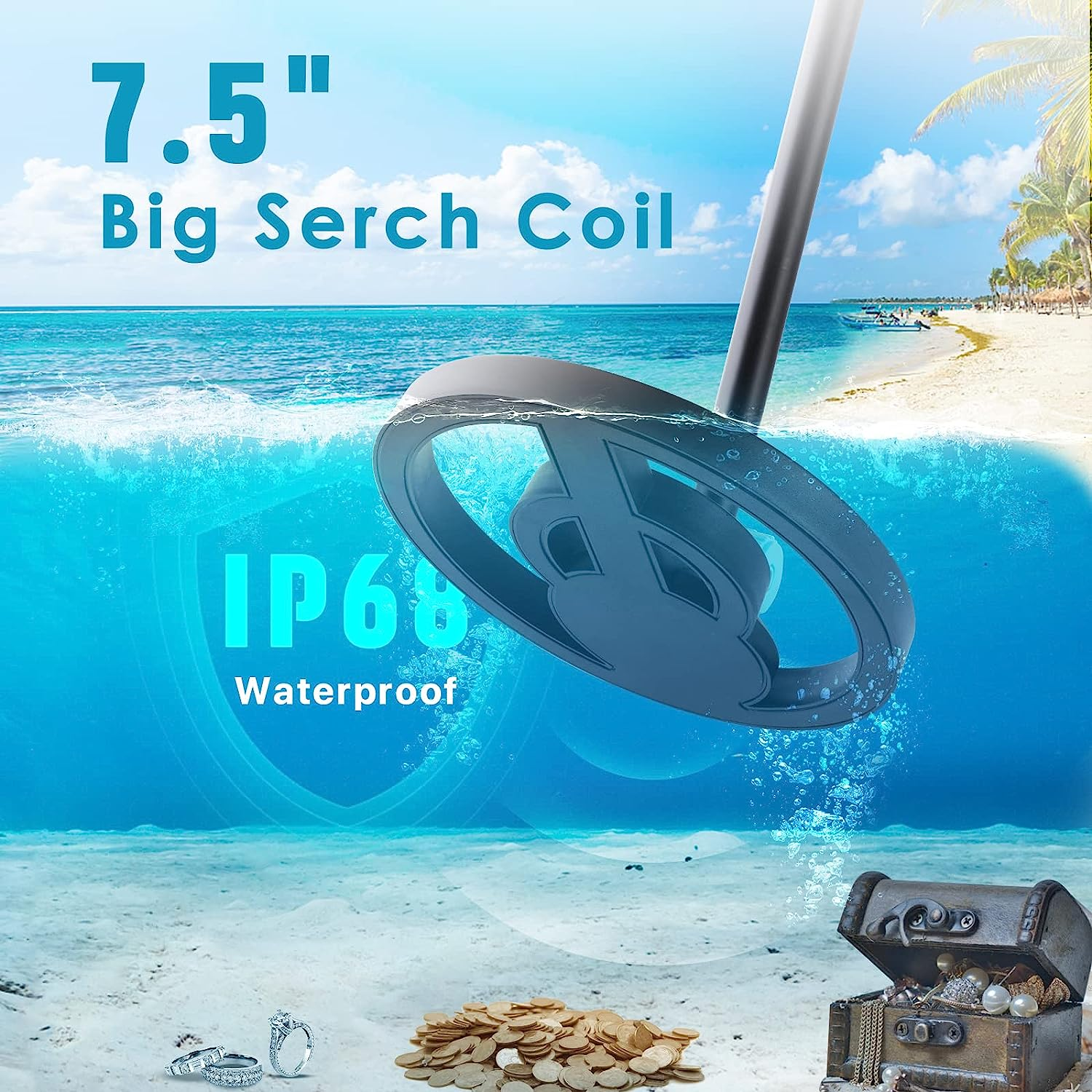 4. Waterproof search coil&Adjustable stem - With 7’’ diameter waterproof search coil enable you to use metal explorer under water.(Note: the control box is not waterproof)
