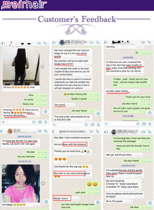 Meir Hair offers very high quality real braizlian human hair weave, wig, 100 human hair extension and other related hair product, and receives very good feedback from our customer. Every piece of human hair is checked by several staff in our company before being posted to our customers. Experienced checking for several times and confirmation of customer, the hair product get satisfaction from our customer.