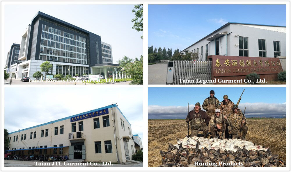 Hunting jackets, pants, vest,pullover,shirt are our main products. All of our hunting clothing are made of high-quality fabrics and accessories, and all of them should be passed the strict and professional quality control system to assure their superior quality. The design department, sales department, development&supply department, production department, quality control department are united together to work efficiently and effectively. Tai'an Legend Garment Co., Ltd. and Tai'an JTL Garment Co., Ltd. are our main wholly-owned factories. By unrelenting efforts and ever-increasing capital investment, BOWINS stands as the leader in the hunting manufacturing industry. Our partners are those famous hunting clothing brands in the Europe and America. High quality products, shorter delivery time and customer satisfaction are our long-term commitments to global clients. Hope to be your partner.
