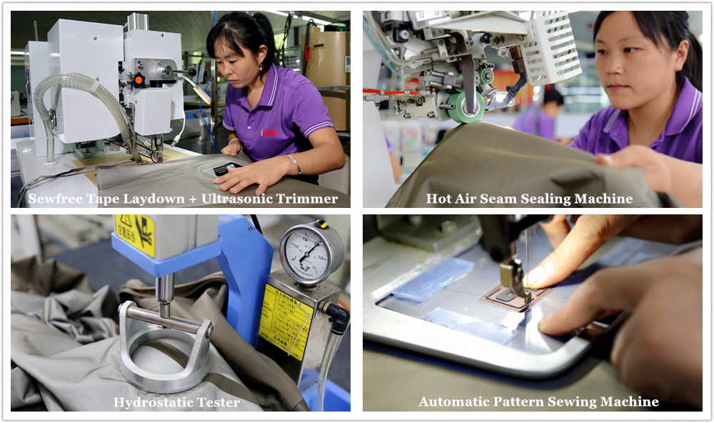 The seam sealing process is very important to functional clothing, which can keep the clothing waterproof even after multiple machine washes. We use the HH brand hot air seam sealing machine made in Hong Kong to ensure that the functional clothing is 100% waterproof. The sealing tape can cover the needle holes at the stitches to prevent water from entering the seams. Our quality control staff is responsible for water pressure testing and data collection to guarantee that the whole garment is 100% waterproof and meets the customer's water pressure standards. The automatic template sewing machine can also be used for logo sewing etc