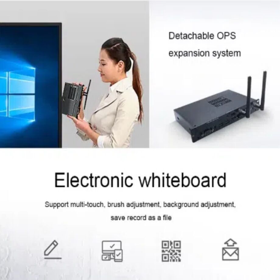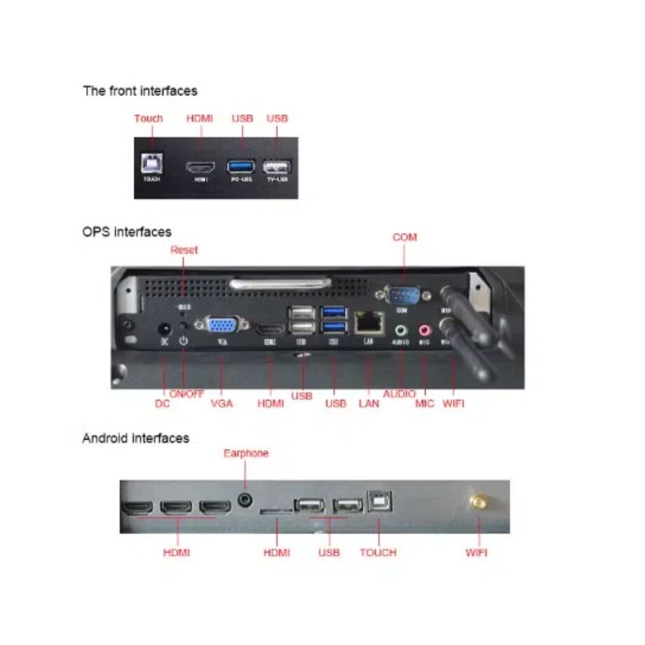 | Interface | Front interface:USB 3.0*2,HDMI IN,TOUCH USB,TYPE-C,Keys Onboard interface:HDMI IN*2,USB 3.0*2,TYPE-C,TOUCH USB*2,HDMI OUT,COAX,RS232,USB2.0,DP,AUDIO IN,VGA,AUDIO OUT,RJ45*2 | ||||