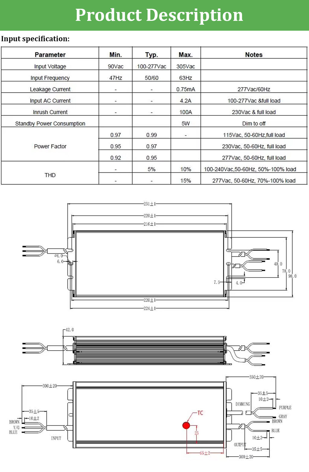 | Input Voltage | 90-305Vac |
