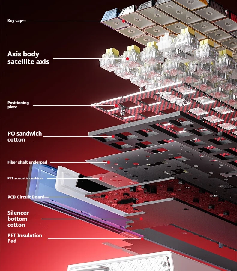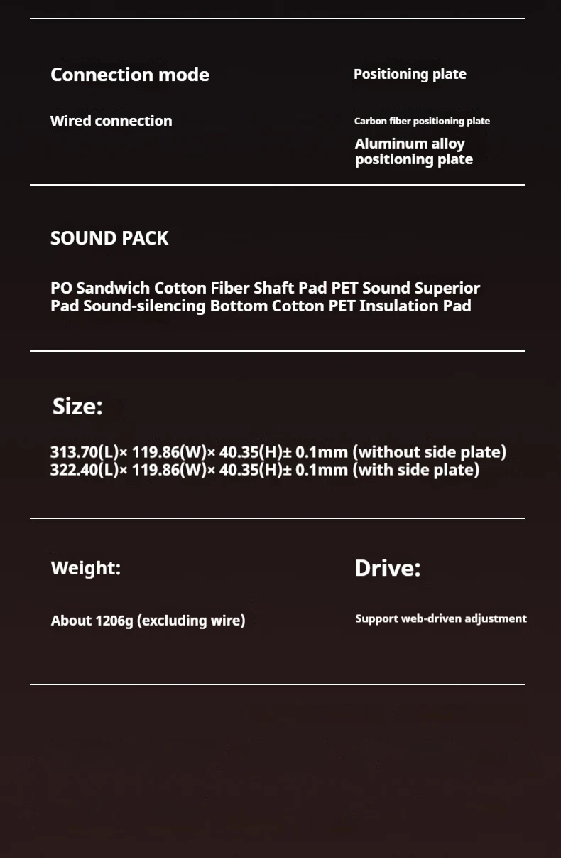 Sound package: PO sandwich cotton + fibre shaft under the pad + PET sound quality pad + sound-deadening bottom cotton + PET insulating pads
