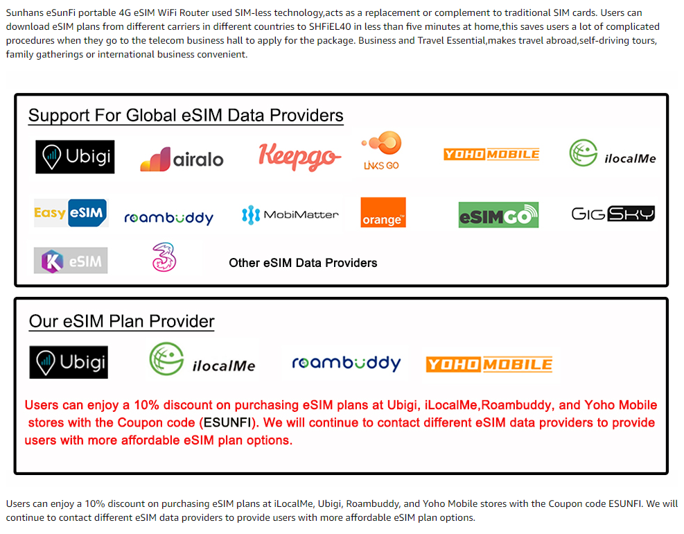 This eSunFi portable 4G eSIM Mi-Fi used SIM-less technology, acts as a replacement or complement to traditional SIM cards. Users can download eSIM plans from different carriers in different countries to SHFiEL40 in less than five minutes at home, this saves users a lot of complicated procedures when they go to the telecom business hall to apply for the package.
