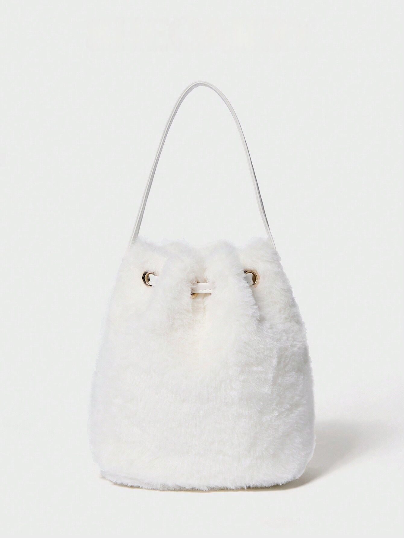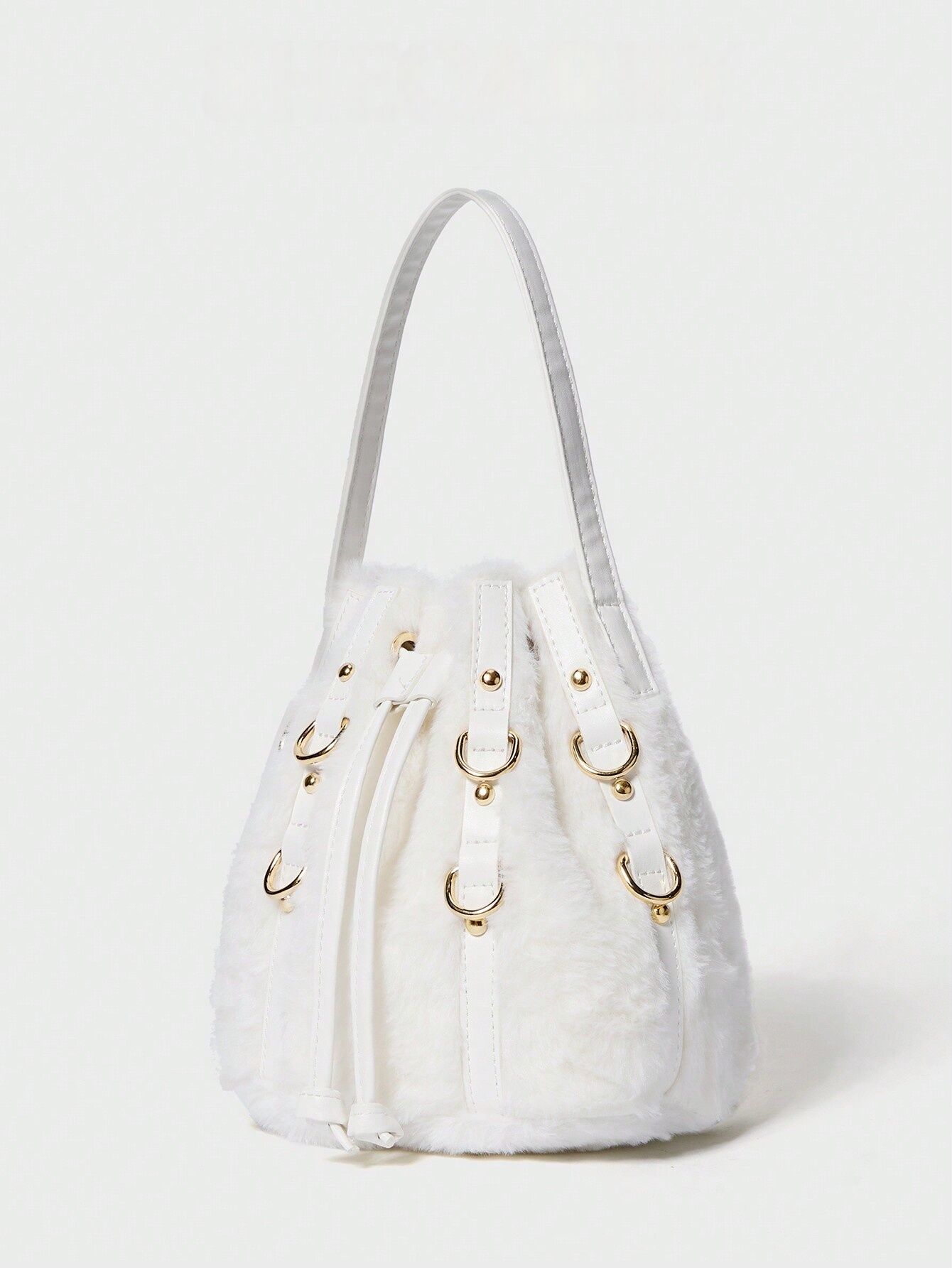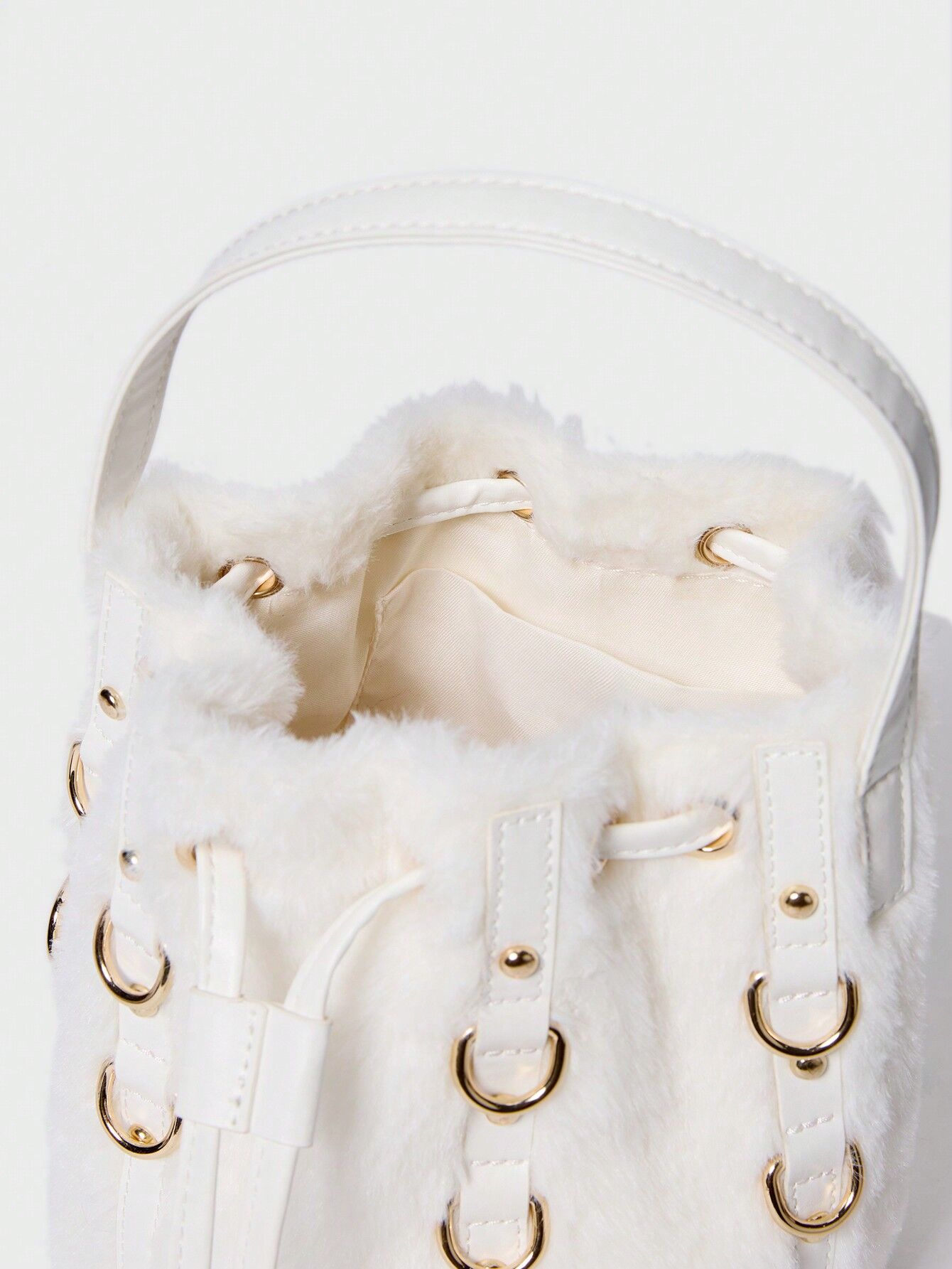 Wholesale Lady Designed Gold Metal Buckle Decorative Plush Leather Splicing Bucket Bag Drawstring Handbag Evening Bag for Women