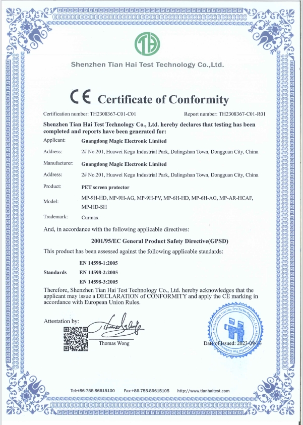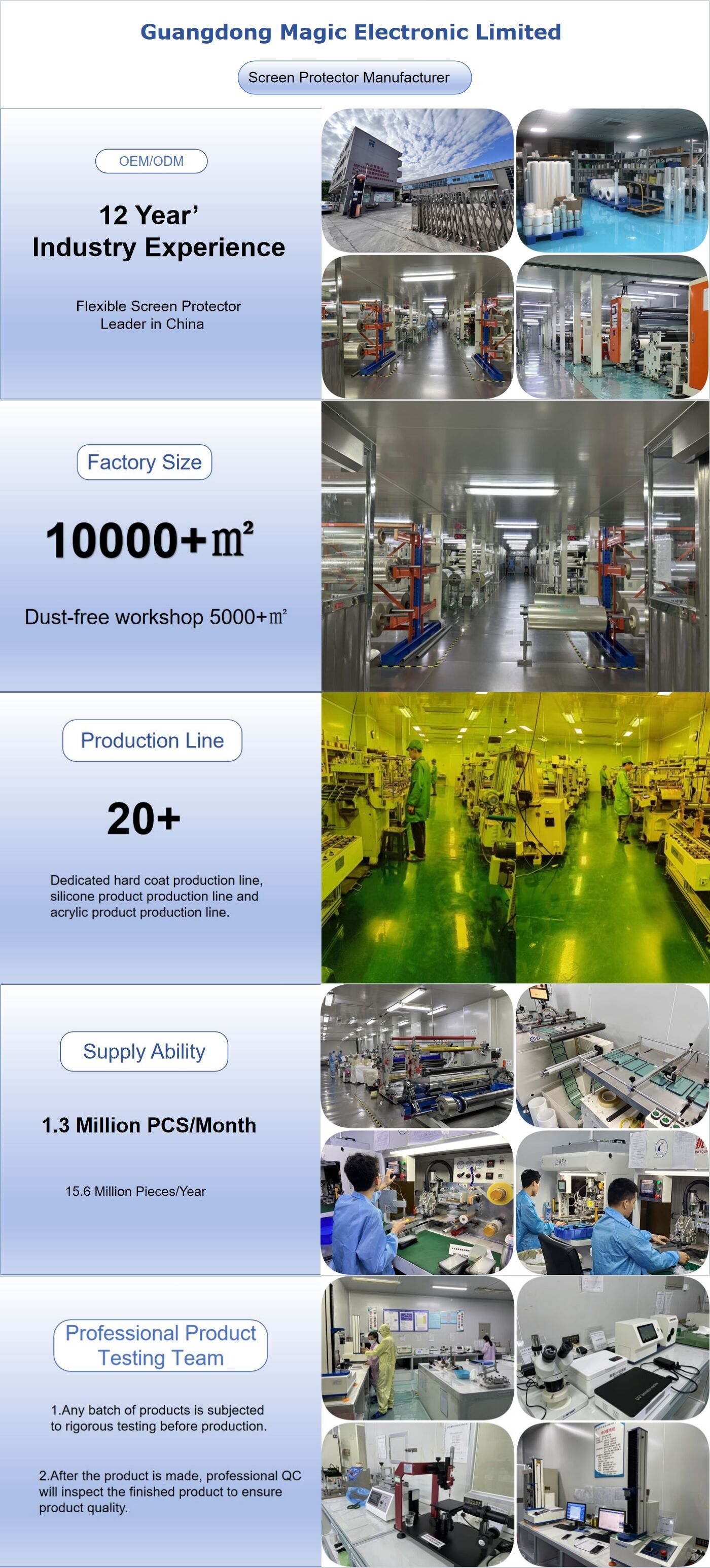 Guangdong Magic Electronic Limited, established in 2015, is a high-tech enterprise integrating R&D, production and sales. Main products: all kinds of Functional soft screen protector such as: UV curing screen protector, Privacy screen protector, TPU antibacterial screen protector, 3D hot bending screen protector, Paper Texture screen protector, optical grade OCA process protection film, for mobile phone, computer, TV & car etc. with formulas and technical support from Japan and South Korea.The company adheres to the service tenet of excellence in product quality and punctual delivery, won the trust and support of global customers.