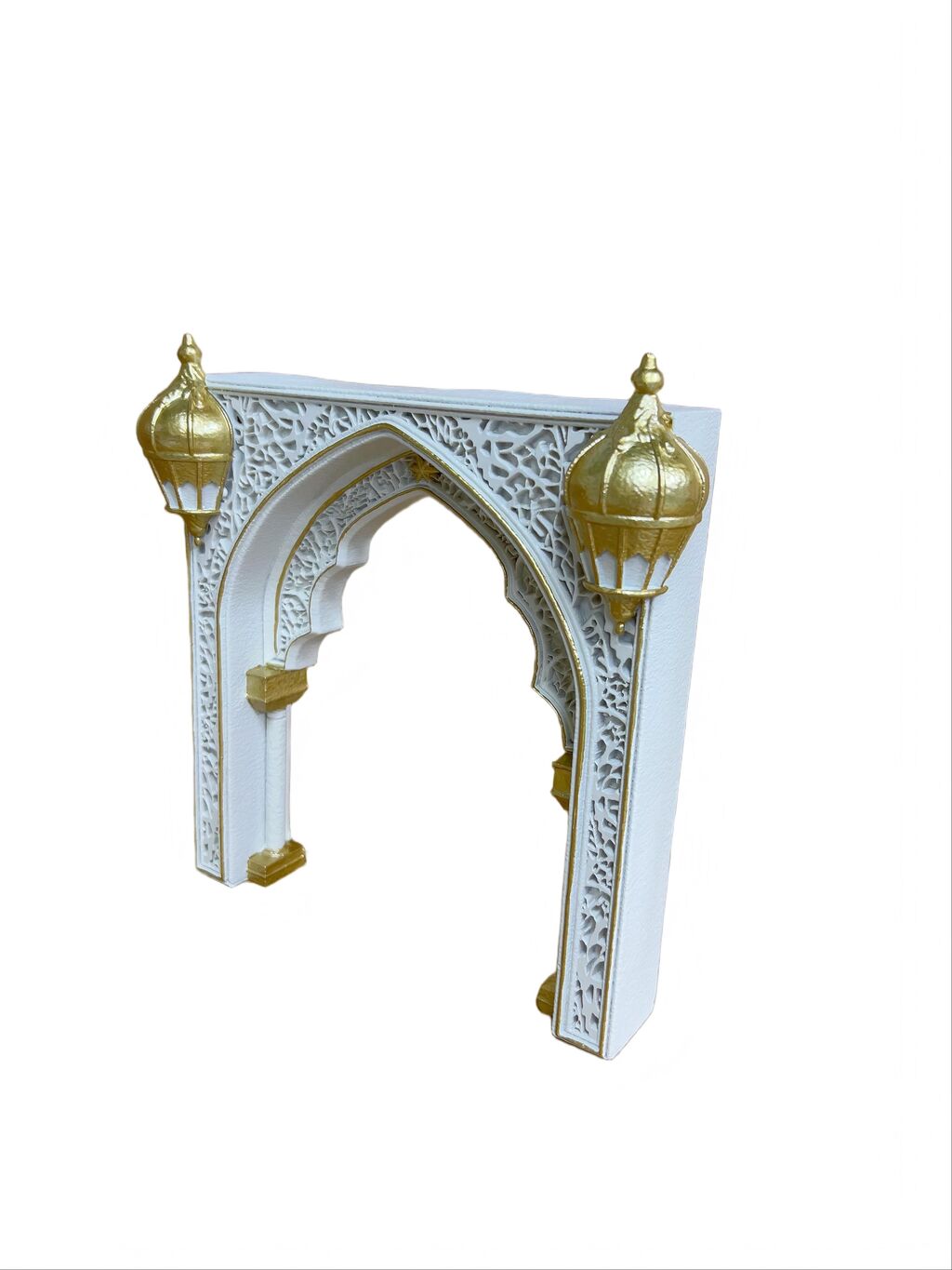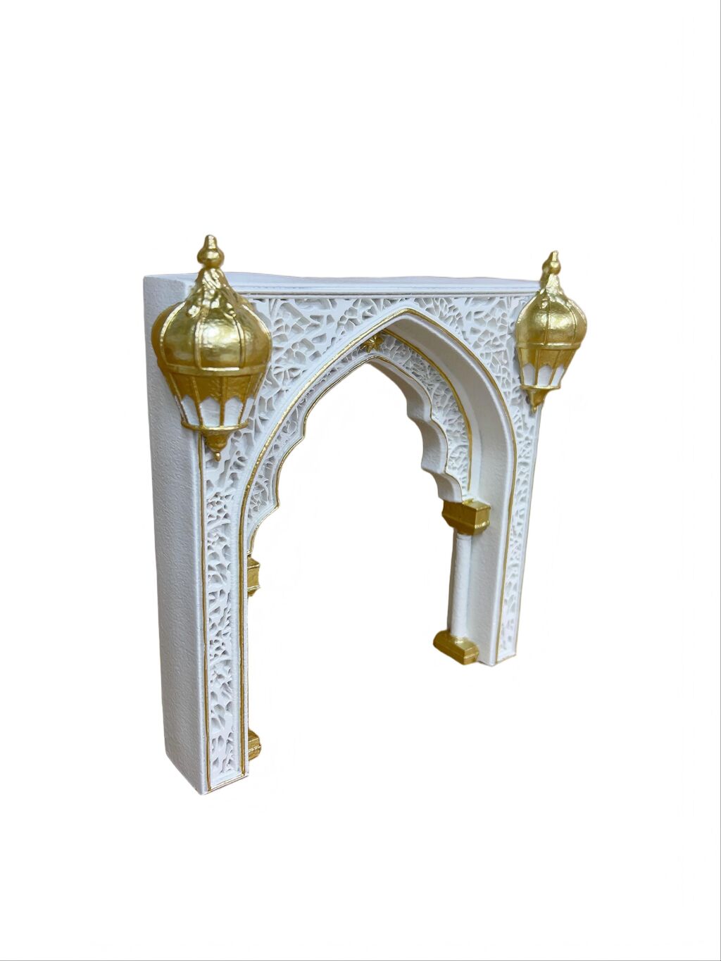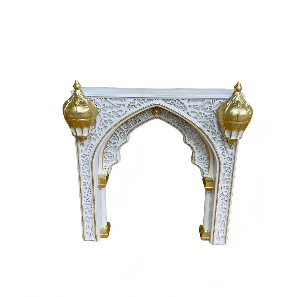 This exquisitely crafted Islamic archway ornament features a classic Mughal mosque architectural design, perfect for Eid Al-Fitr, Ramadan Kareem, and other Muslim festival decorations. The piece combines elegant white hollowed-out carvings with luxurious gold accents (including 2 decorative lanterns on the top sides), presenting a delicate and sacred aesthetic that fits traditional Islamic cultural themes.