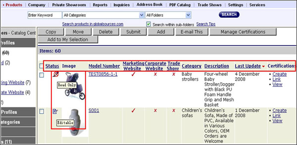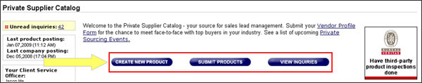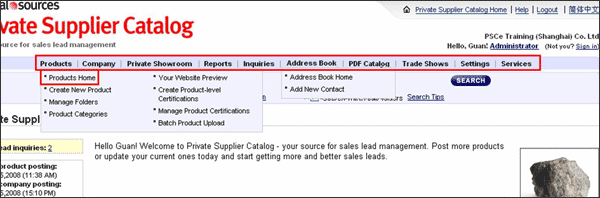 When you log in to the homepage, prominent new buttons put the functions you need most just a click away. Create New Product and Submit Products buttons take you straight to your most important work. And for the Super Administrator and Administrator user roles, a View Inquiries button gives you direct access to your latest sales leads.