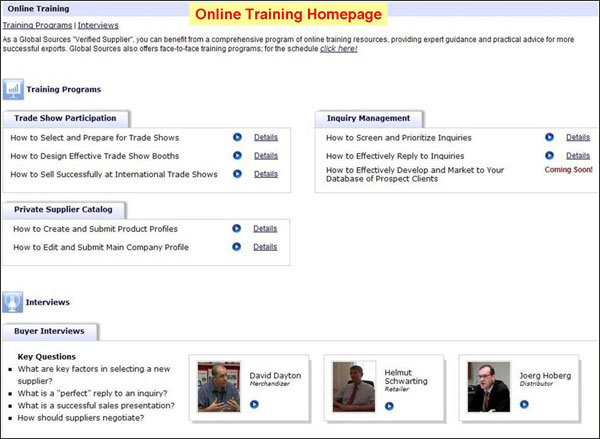 Want expert advice on trade show preparation? Or tips on how to improve your replies to inquiries? Our new online training programs provide all of this and more. Conducted in Mandarin, these courses are available to Global Sources' Verified Suppliers in mainland China, Hong Kong and Taiwan at no charge. Simply click on the Online Training link under the Services menu, and learn how you can take your business to the next level.