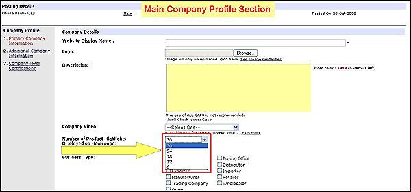 Go to the Main company profile section to set the maximum number of Products Highlights to display: 6, 12, 18, 24 or 30.