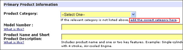 Adding product categories from the Product Profile page is more straightforward than ever. If you need a category that is not already in your pick list of pre-set categories, click the "add the correct category here" link to open a separate search window.