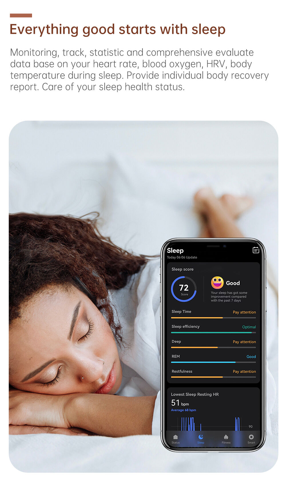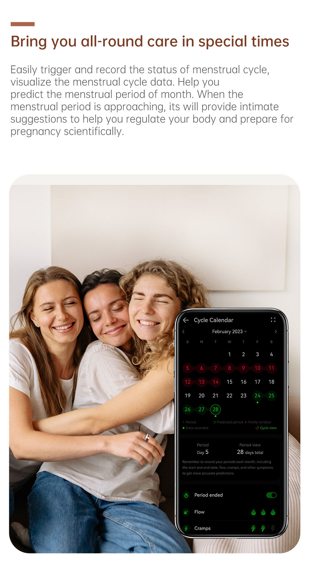 | Health Management | Sleep, body temperature, body recovery status, Heart rate, HRV, spO2, Menstrual cycle management |
