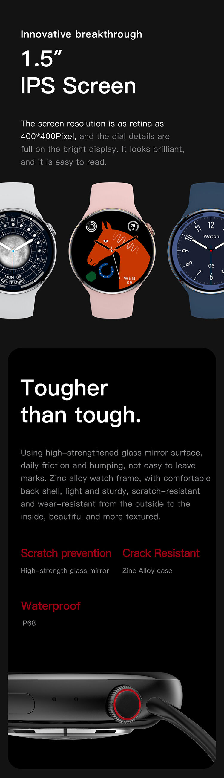 Display: 1.5inch IPS screen, 400*400 pixel
