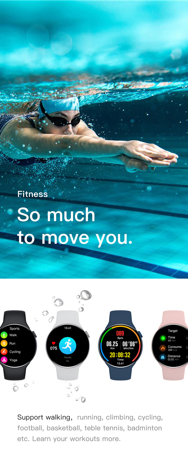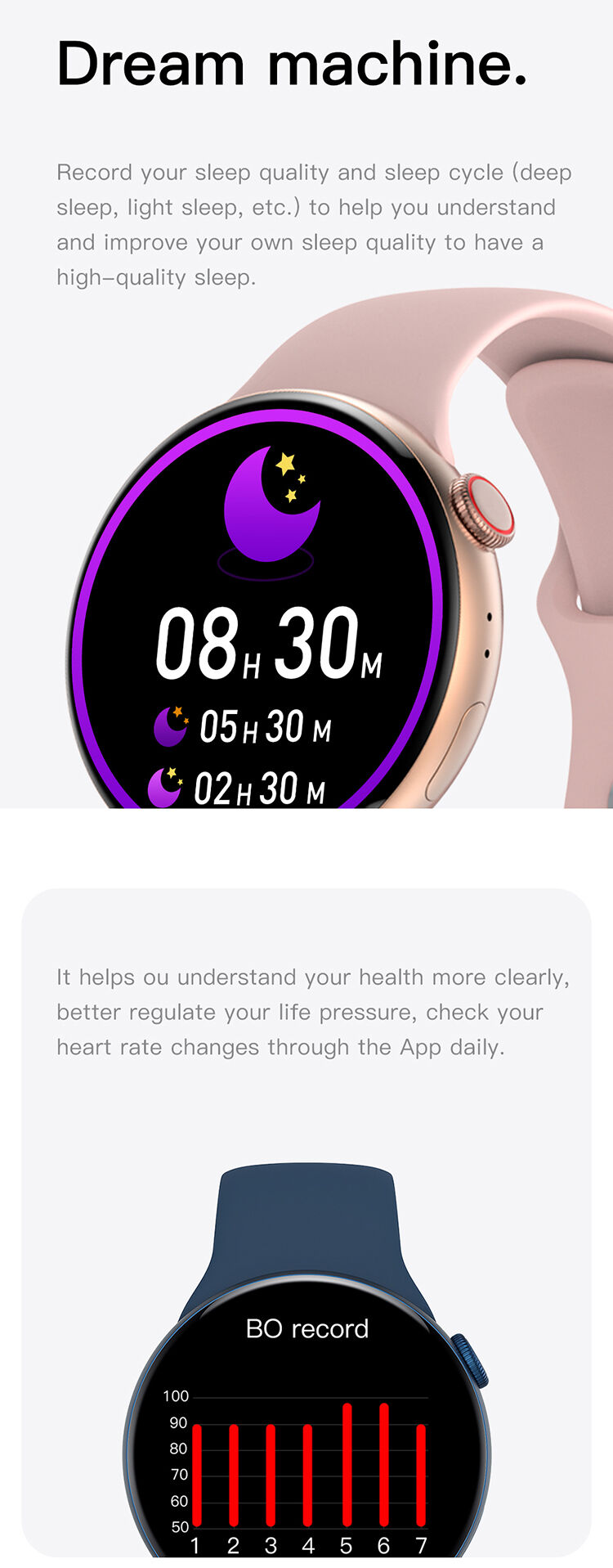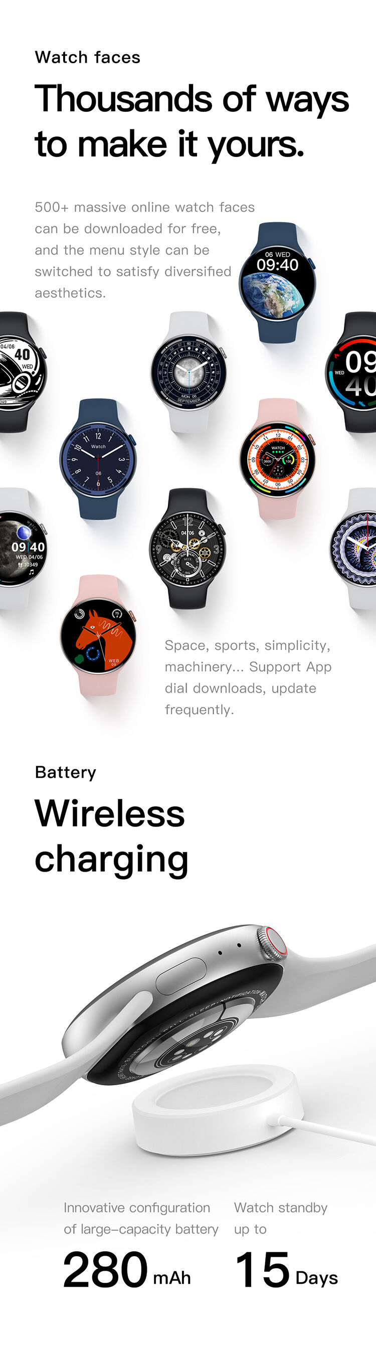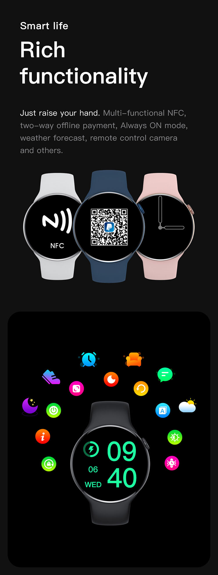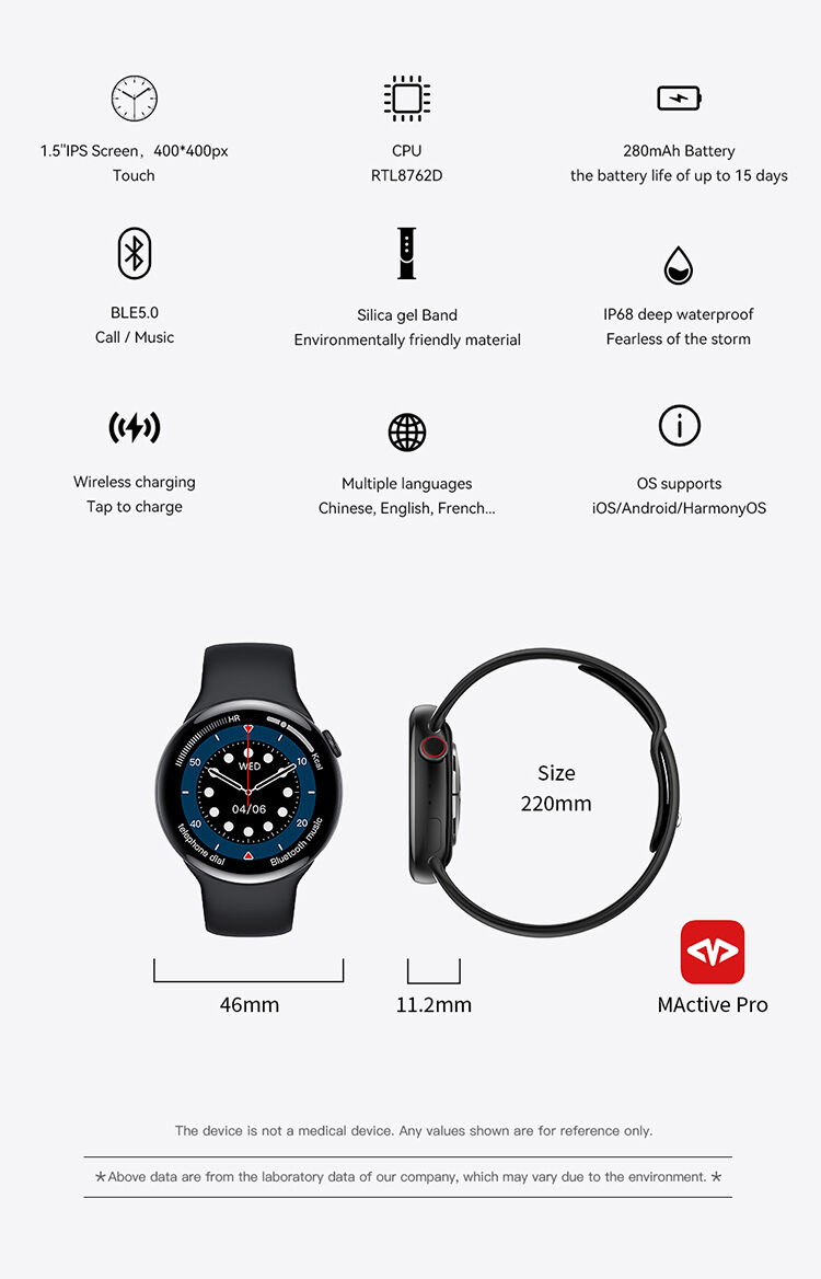 500+ watchfaces free download, wireless charging, Bluetooth call, IP68 waterproof, voice assistant, NFC access control, independent ringtone, independent clock, Always ON screen, bedside lamp, female physiology, body temperature, heart rate and ECG, blood pressure, blood oxygen, sleep, step counting, Bluetooth camera, Bluetooth music, friends, payment code, calculator, phonebook, weather, stopwatch, timer, alarm , Pinlock, flashlight, massage.