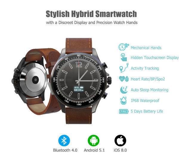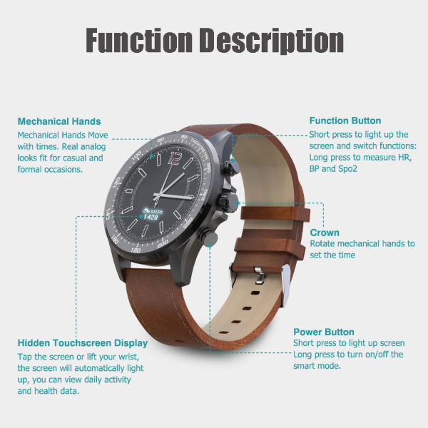 Features: Real watch,Hidden touchscreen display,Heart rate monitor, Step pedometer,Calorie burnt,Distance track, Time display,Alarm remind,Sedentary remind,Sleep monitor,Camera remote control, Find phone,Touch switch menu, Two point touch display,Call remind, Message alerts, Notification.