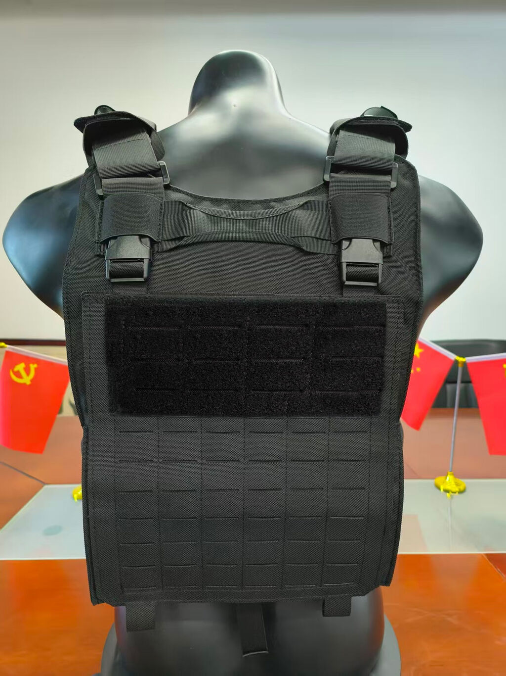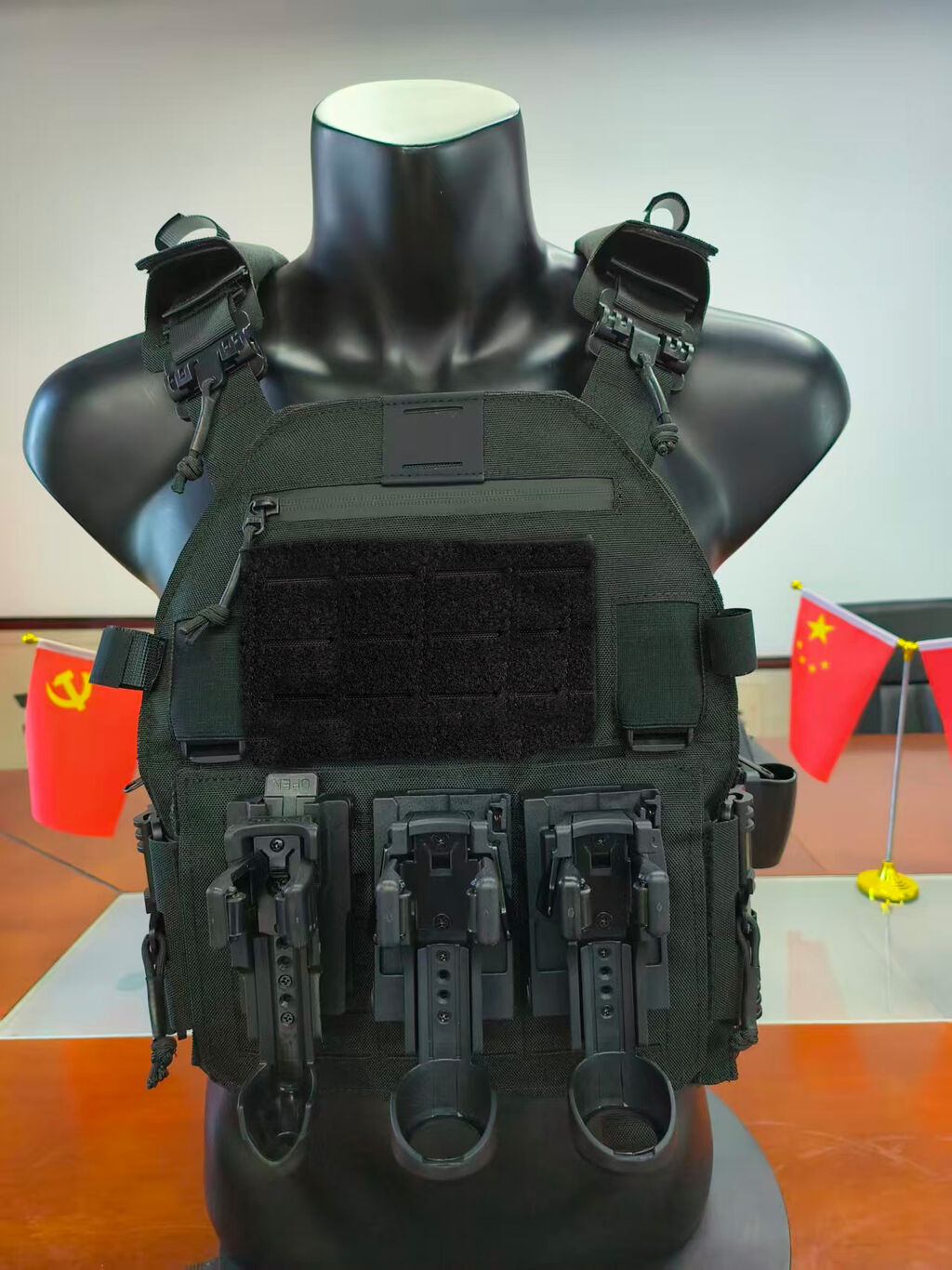 6.战术背心本体及附包均使用1000D 面料,具有防尘耐油污、耐磨和防泼水性;背心还可以根据作训需要装配防刺内胆和防弹插板。