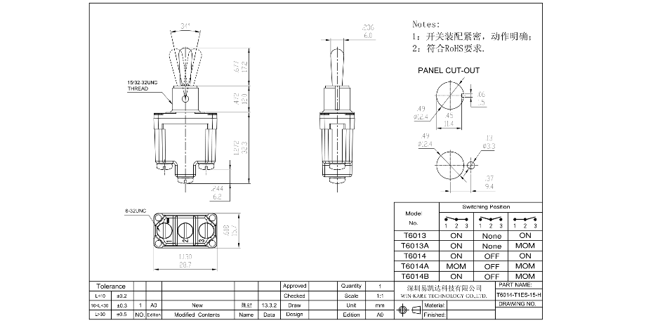T6013-T1ES-15-H Waterproof Level IP68 ON-None-On Rohs Toggle Switch