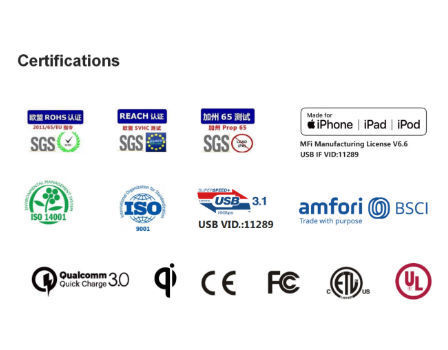 7. Certificcates: MFi; CE, RoHS, REACH for EU market; Pro 65 for US market;