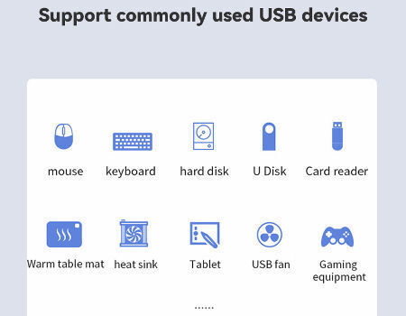Support commonly used USB devices: mouse, keyboard, hard disk, U Disk, card reader, warm table mat, heat sink, tablet, USB fan, Gaming equipment,etc.
