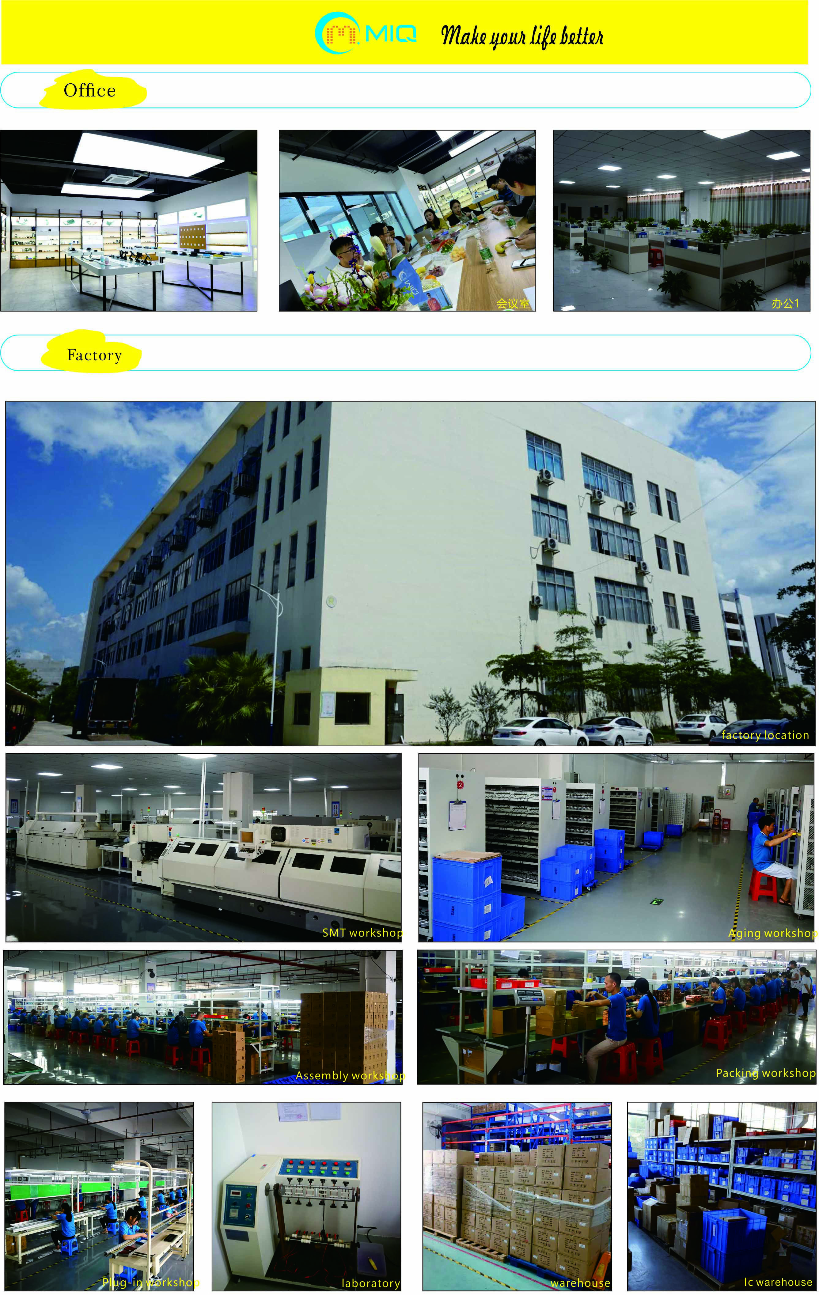 Our factory has been certified by ISO-9001,BSCI,SEDEX and other authoritative global organizations.Our factory has more than 10 years of experience in R&D and production.We have our own SMT equipment, injection molding equipment, aging equipment, CNC processing equipment.From mold manufacturing, injection molding, aging, testing, assembly, packaging and other integrated production lines. Factory overview is 20000 square meters area with 500 skillful workers. We have strict quality detection in all kinds of production process such as incoming materials, production, packaging to make sure goods quality with most effective guarantee. We have a professional research and development team, including power designers, ID designers, 2D,3D,ProE computer modeling engineers, graphic designers, electronic engineers, product certification engineers. We have our own research and development lab, and we have all kinds of tests. MQI is focused on new products developing, and we have many design patents and practical patents.