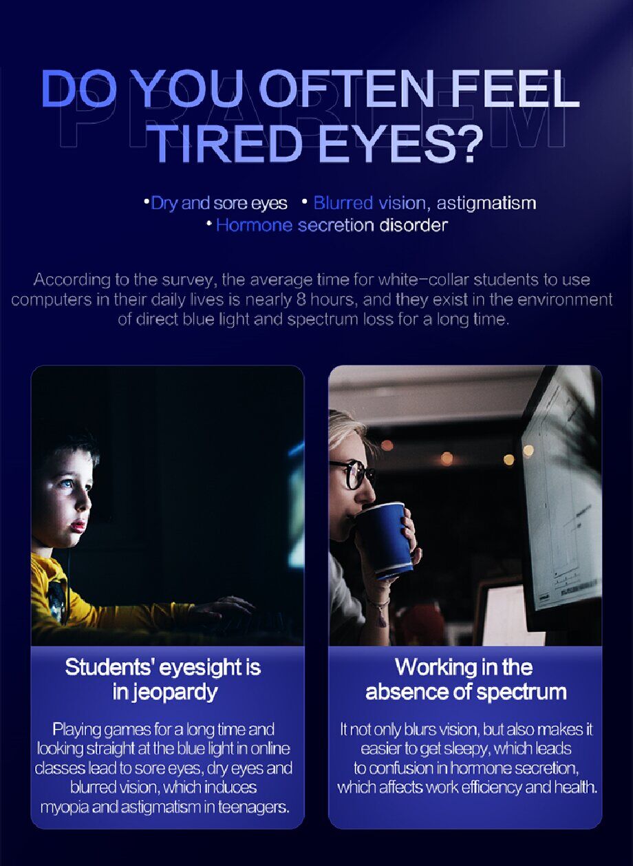 Say goodbye to eye strain and fatigue with our carefully calibrated LED technology. Our screen light emits a soft, glare-free glow that perfectly complements your monitor, reducing blue light exposure and promoting long-term eye health.