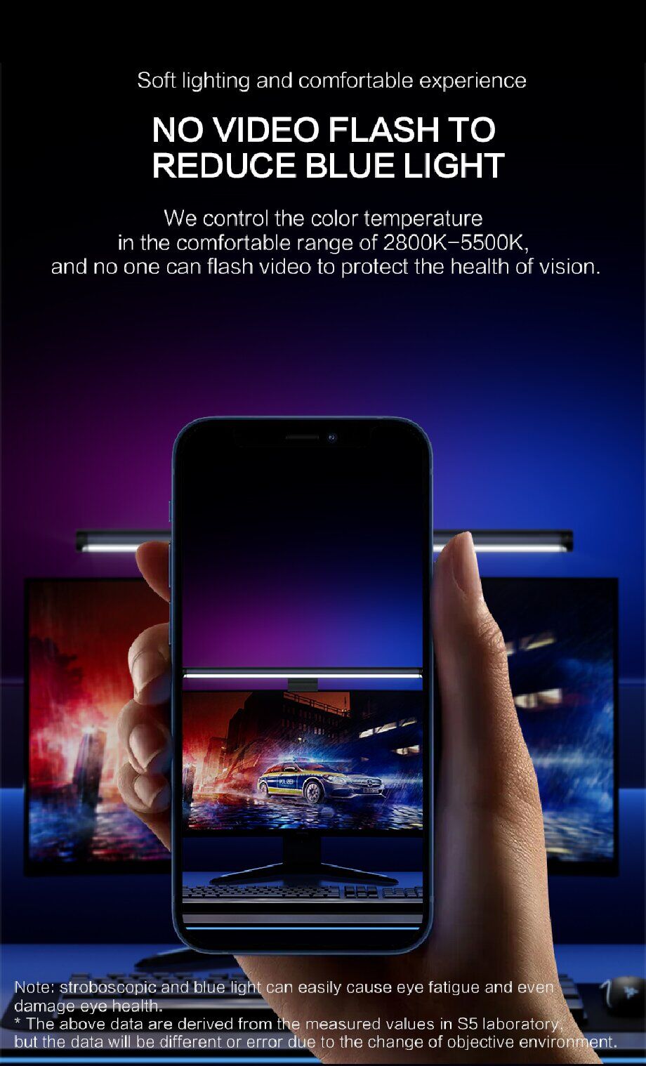 Perfect for laptops, desktops, and even tablets, our screen light attaches easily with a strong yet gentle clamp that won't damage your device. Its slim profile and lightweight construction ensure minimal desk clutter, maximizing your workspace's potential.