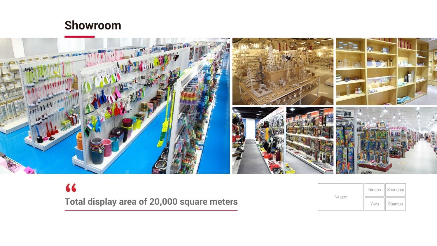 Market Union has a 6,000m² showroom located in Central, Ningbo and a 2,000-square-meter showroom in Yiwu, displaying more than 50,000 items.