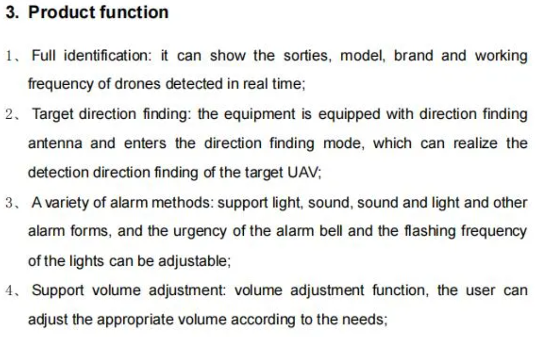 JYT- H1B is suitable for drone monitoring in scenarios such as major events, daily security patrol, VIP secret service, critical infrastructure etc. It works offline or online, with option to connect multiple devices to cover large area. It is highly portable, easy to carry and use, ready to deploy in seconds.Product composition: