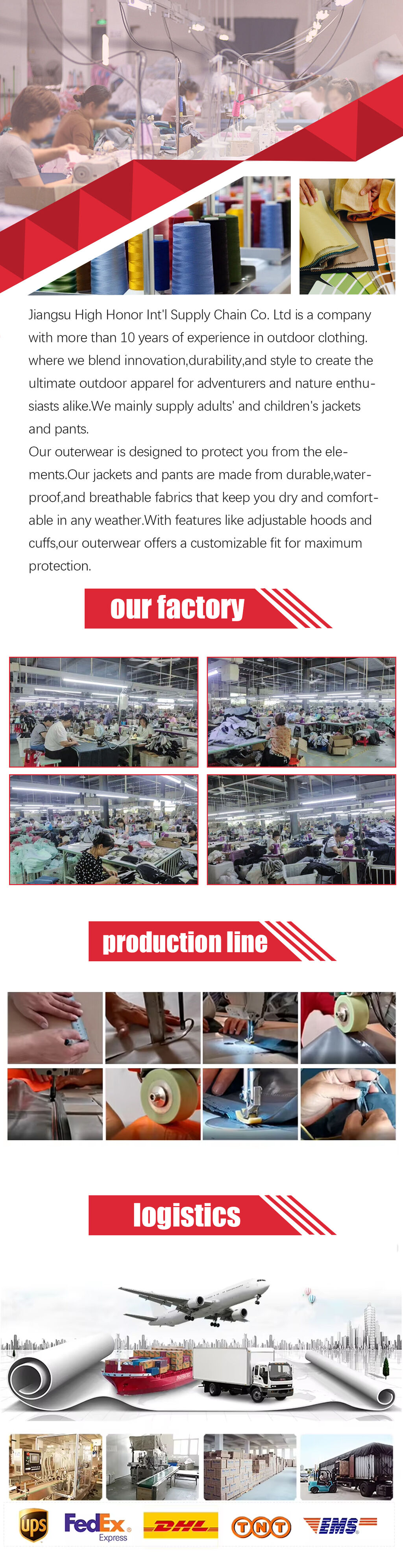 Jiangsu High Honor Int'l Supply Chain Co. Ltd is a company with more than 10 years of experience in outdoor clothing. where we blend innovation,durability,and style to create the ultimate outdoor apparel for adventurers and nature enthu-siasts alike.We mainly supply adults' and children's jackets and pants.
