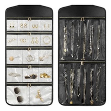 This hanging jewelry organizer from Ningbo General, the GUA0823, 16 clear pockets, 12 hooks, large zipper pockets and a 360-degree rotating main hook. It is made of microfiber leather. A minimum order of 3,000 pieces has a lead time of 45 to 60 days. Per piece, the item is quoted at $17.99.