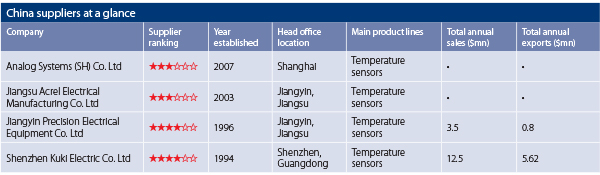 There are hundreds of temperature sensor manufacturers in China. Most offer products for the medical industry, shipments of which represent between 10 and 40 percent of the total.