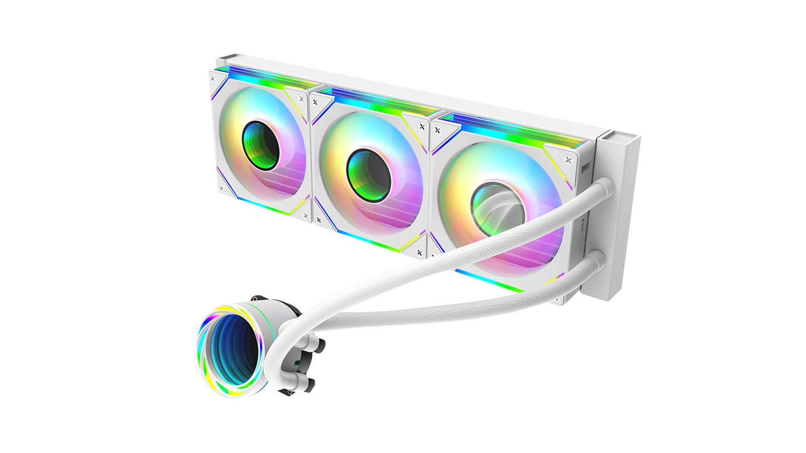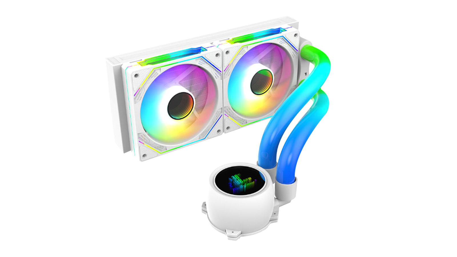 The LC-360 White from Guangzhou Qianxi is a CPU cooler with a 12V pump and a 5V LED. The pump, with a ceramic bearing, has 2,300rpm±10 percent speed and 50,000-hour life span. This product has three 120x120x25mm fans and a hydraulic bearing and delivers 67.96CFM air flow at a fan speed of 800 to 2,000rpm±10 percent and a noise level of 15 to 35dB.