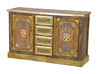 Made of termite-resistant reclaimed mango wood, this SAF -10 antique reproduction cabinet from Artisans Art India has four center and two side drawers with brass ring pullers, brass inlay, floral design and antique finish in subdued colors. Dimensions are 48x16x36in. The minimum order of two items has a 90-day lead time. Price is quoted at $200 per piece.
