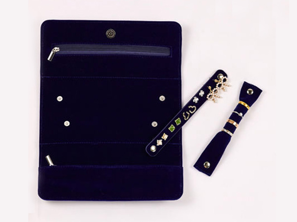 Available for OEM/ODM, this elegant travel jewelry roll, the GSB2111-031, is made of velvet and measures 28x22cm. It has plenty of space to store rings, earrings, bracelets, necklaces and other jewelry items.