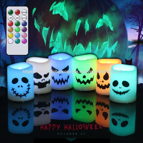 This color-changing LED Halloween candle from Good Seller Co. Ltd, the HD-06-#066, runs on a CR2450 battery with 600mAh capacity and more than 300 working hours. This 2x1.5in candle comes in six designs and with an 18-key remote controller with timer function.
