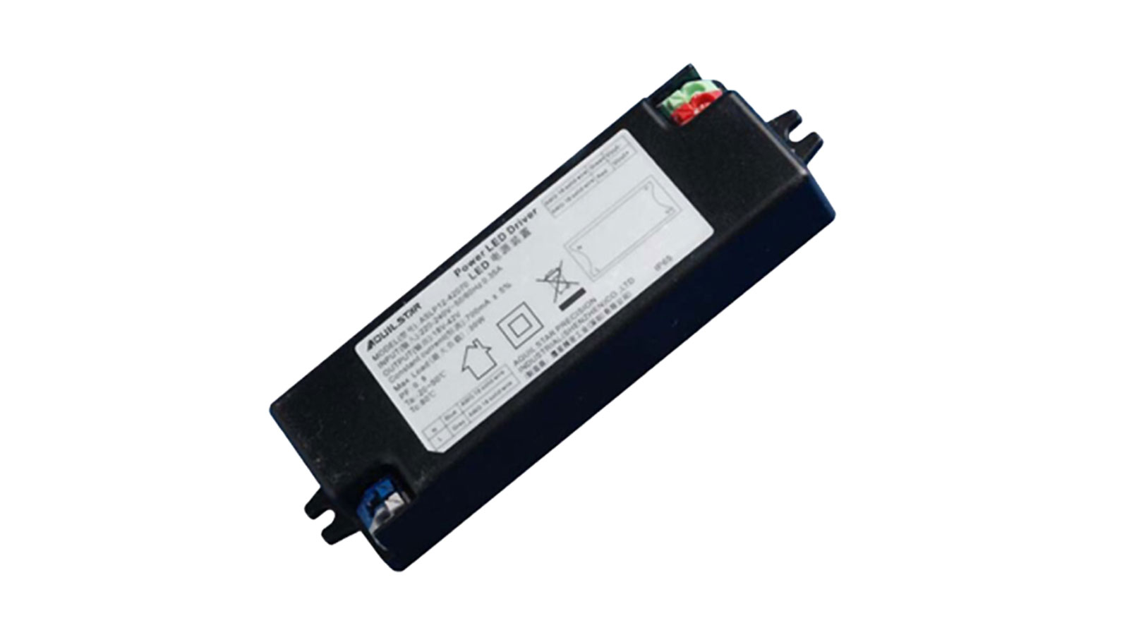 From Shenzhen Aquilstar, the ASLP12 18-42V 700mA Black LED driver has an input rating of 90 to 264VAC, 47 to 63Hz, maximum 600mA at 90VAC. At 240VAC, the inrush current is up to 30A and the leakage current is 0.25mA. The maximum no-load power consumption is 0.3W, the output power 30W and the constant-current precision ±5 percent. This power supply has overcurrent, -voltage and short-circuit protection.